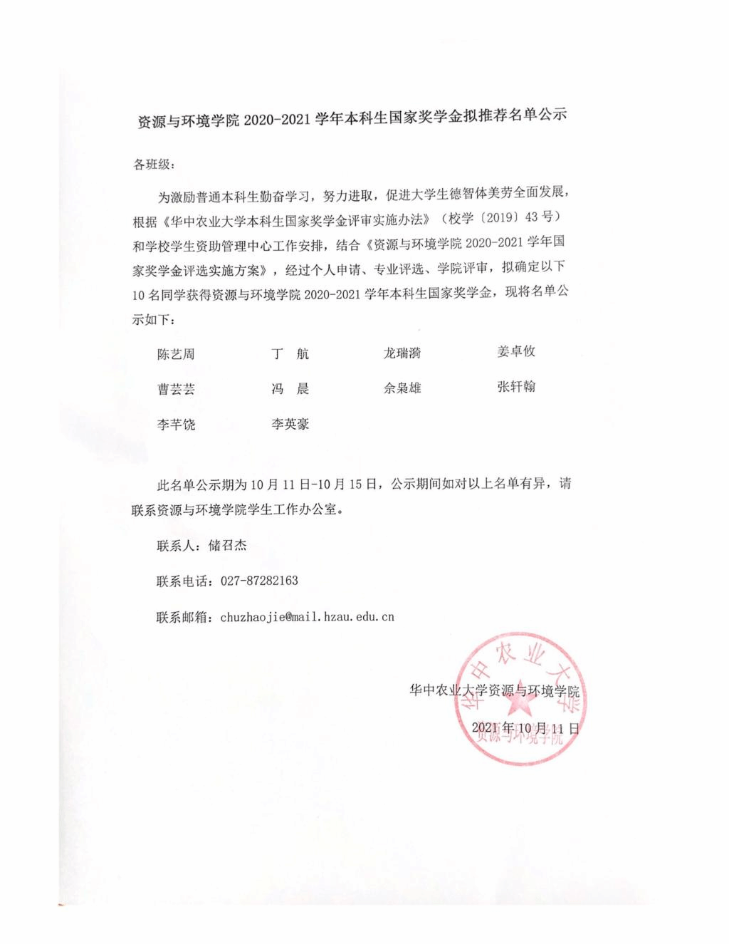 nba88看球 2020-2021学年本科生国家奖学金拟推荐名单公示