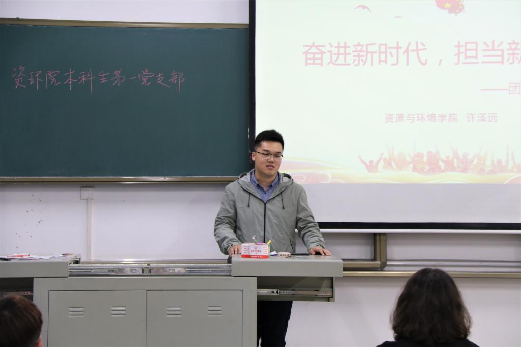 伴随着激昂的团歌旋律,此次团课拉开序幕。许泽远以“奋进新时代,担当新青年”为主题浅谈团十八大精神。“因为徐本禹的故事而感动,因为感动而想有所行动。”许泽远向大家简单介绍徐本禹的支教事迹,以此引导学生以徐本禹为榜样,做一名有理想、有本领、有担当的新青年。他说道:“18级新生就要像习总书记说的那样‘扣好人生第一粒扣子’,作为一名大学生应该培养正确的价值观、人生观和世界观,希望你们牢记习总书记教导,在复杂的环境中走出自己正确的道路。”