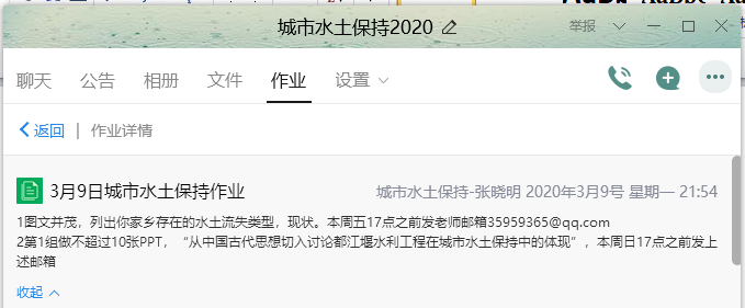城市水土保持是面对环境类专业新开设的通识课程,但选课结果却让人小有吃惊。除了一些环境相关的专业学生选修外,还有一些传统的社科类专业,如英语、法学、经济学类等等,学生来自不同的年级,位置也因为疫情散布于全国各地,本人也被隔离在外地。但疫情仅仅隔离的是师生之间的物理距离,“停课不停学”的信念让我们的心走得更进了。针对上述情况,兼顾不同专业的同时,尽可能地发挥不同的专业特长,如组织法学专业的学生作为讨论小组,以“起诉书”的方式就城市水保违法违规案例进行虚拟法庭演练。以“家乡”为主题开展系列城市水保的文献查询及调研学习,如“你所在家乡城市水土流失的特点、水土保持工作的现状、水土保持规划的特点……”,使学生了解家乡,热爱家乡,结合宣讲水土保持科学奠基人关君蔚院士的事迹,传承“黄河流碧水,赤地变青山”的开拓精神,润物细无声地渗透家国情怀。