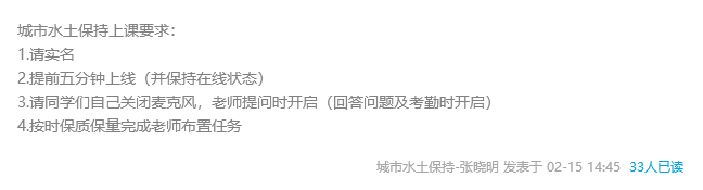 由于疫情采用新的教学方式,边参加培训(如参加“疫情防控时期教师在线教学系列培训”)、边应用上课、边总结提高。申请开新课之前除了必要的前期调研外,还特意征询了长期从事城市水保工作的业内专家们的意见,不断的优化课程教学内容,结合通识课的特点让教学更接“地气”。