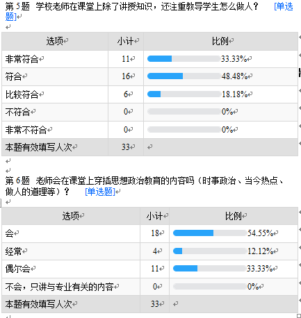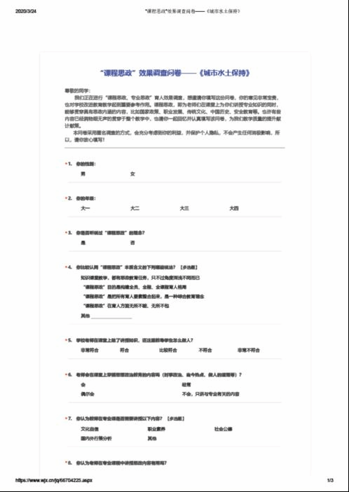 将课程思政划分为家国情怀、做人做事和科学观三个层次,与通识课程深度融合,这种深度融合不是物理嫁接、更不是堆砌,而是让两者产生化学反应,如盐溶于水,润物细无声!一方面让通识课上出“思政味”,另外一方面又保持原有通识课的知识理论框架,在课程思政元素挖掘和深度融合通识课程途径上做一些初步的探索,学生反馈效果很好。(附城市水土保持课程思政调查问卷选摘)