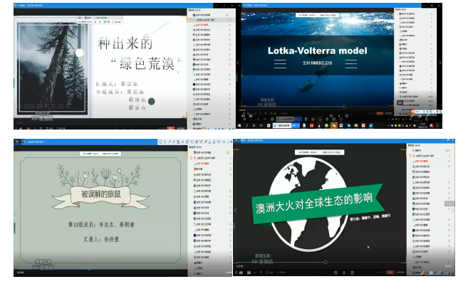 三、学以致用,多途径考核学习情况。根据疫情下对学生的考核要求,选择平时成绩+小组汇报+网上开卷考试综合考核模式对学生学习情况进行考察。在小组汇报中,学生用所学的生态学理论以及通过查阅文献资料对目前面临的生态问题、有趣现象及时事热点进行重新解读。如:“澳洲大火对全球生态的影响”、“一鲸落,万物生”、“如果没有蚊子”、“种出来的“绿色荒漠””等,提高了学生对所学知识的运用能力。网上开卷考试考题的设计也偏重于学生对所学知识的理解和运用。
