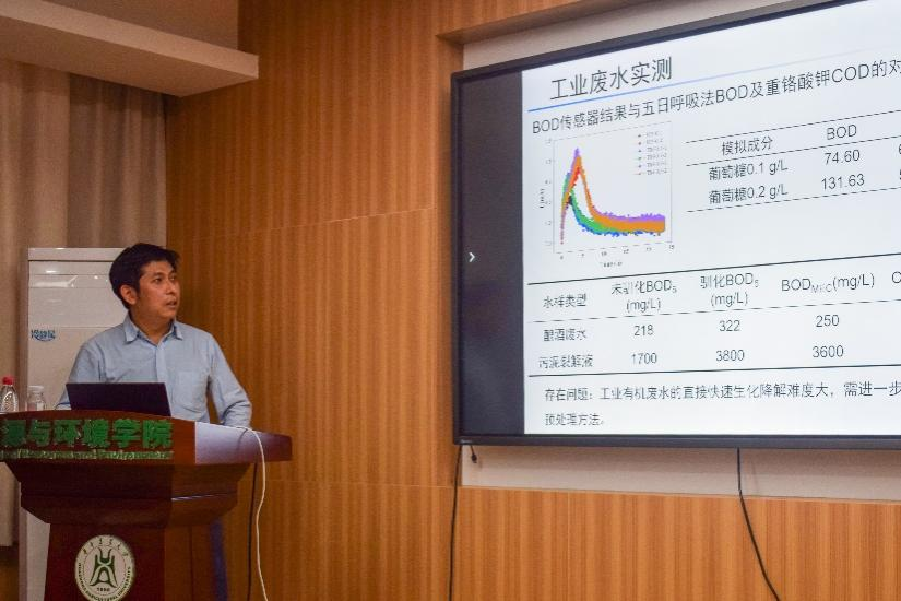 王鑫以微生物电化学BOD传感为切入点,介绍课题团队在BOD原理及应用领域的研究进展。微生物电化学BOD(生化需氧量)设备是一种用于测量水体中有机物氧化的仪器,能够实时监测水中的有机物氧化过程,为水质评估和环境保护提供准确数据。王鑫团队通过对活体生物膜进行标准化、高稳定设计,优化BOD值测定和计算速度,使设备体积不断缩小,并实现了手机端实时监测的目标。王鑫提到:“微生物电化学技术是目前唯一有希望实现BOD在线传感的技术原理,因为它是唯一能够在线定量表征活体微生物降解污染物转移电量的方法。”随后,现场师生针对“传感系统的电极材料是什么”“碳氮比是否会对传感系统的微生物产生影响”等问题与王鑫展开探讨交流。