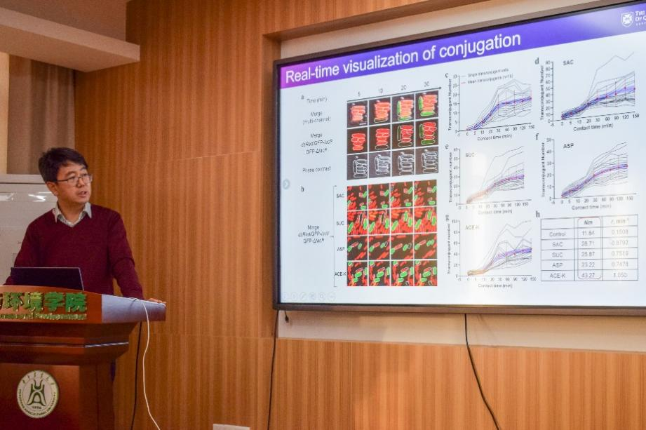 郭建华以“How to fight against antimicrobial resistance?”为题做学术报告,围绕“抗菌药物耐药性(AMR)目前的形势有多严峻?”“AMR在环境中如何兴起并进行传播?”“除了抗生素之外,AMR有其他的隐形触发因素吗?”等十个具体问题展开介绍。抗生素耐药性是一个全球性的公共卫生问题,全球每年至少有130万人死于抗微生物药物耐药性,“药物的长期服用,除了导致肠道菌群的紊乱,也可能引起一些其它病变,甚至引发癌变可能,非抗生素的药物能加速基因转移或是突变”,因此课题团队专注抗生素耐药性的环境层面,开发使用新材料的先进消毒工艺以对抗抗生素耐药性在环境中的传播。
