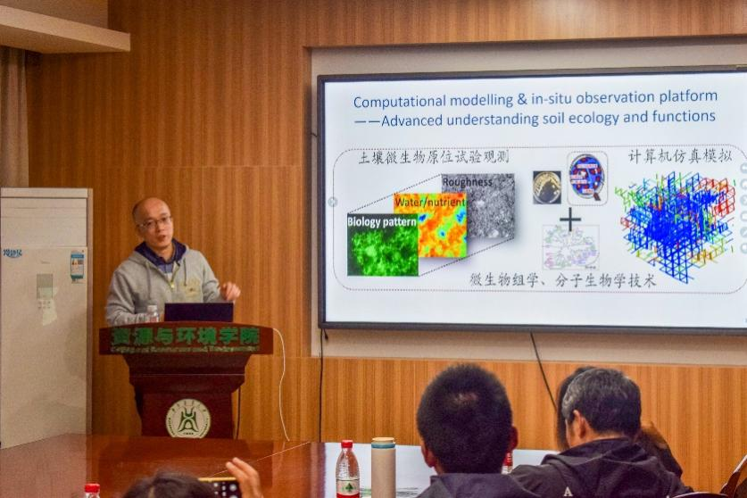 王钢从喝咖啡的日常谈到微生物的“咖啡环效应”报告了课题团队在细菌视野的微观界面过程与微生态领域的研究成果。他从土壤微生物学研究的新方法新技术着手,通过计算机仿真模拟和显微镜下的个体细胞和群落尺度原位观测方法相结合探讨土壤微生物的相互作用关系阐明了异质性和水分分布调控微观界面微生物竞争与共存,细胞运动与物质扩散影响矿物养分生物地球化学过程。同时,他以个人经历启示各位师生,科研需要敏锐的观察力,日常生活中的微小事物也许能帮助我们找到科研灵感