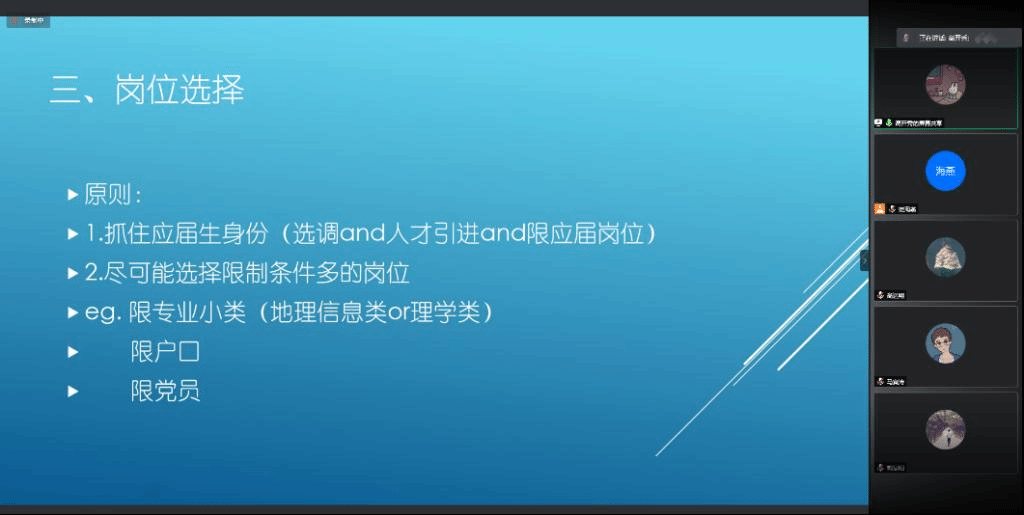 高开秀从公务误区、公考原因、岗位选择、备考经历等四个方面给大家分享了她成功考取天津市规划和自然资源局红桥分局公务员岗位的整个过程。她建议师弟师妹们抓住应届生身份,尽可能选择限制条件多的岗位,竞争压力相对较小。关于如何备考笔试,她推荐大家系统地精听公考机构的课程并做好笔记,然后刷题总结,找准自己的强弱项并针对性地练习提分。另外,她十分建议同学们参加公考机构每周末的模拟考试,感受考试氛围、训练考试时间分配。