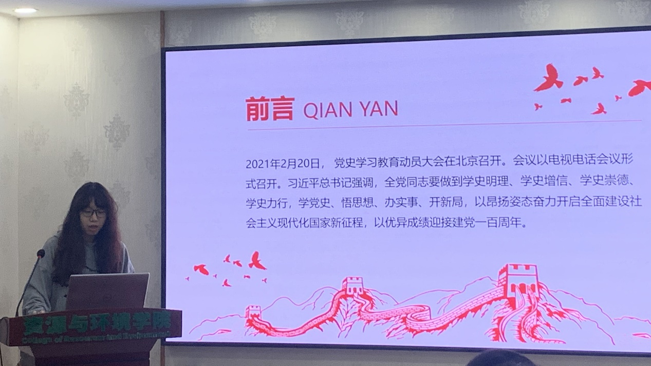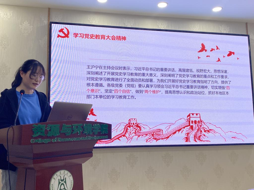 杜欣怡同志带领在场同志们重温了习近平同志主持中共十八届中央政治局第七次集体学习时的讲话——学习党史、国史,是坚持和发展中国特色社会主义、把党和国家各项事业继续推向前进的必修课。她以习近平总书记提出的两个要点出发,向大家介绍我校华中农业大学在动员党史学习工作中做出的积极响应。