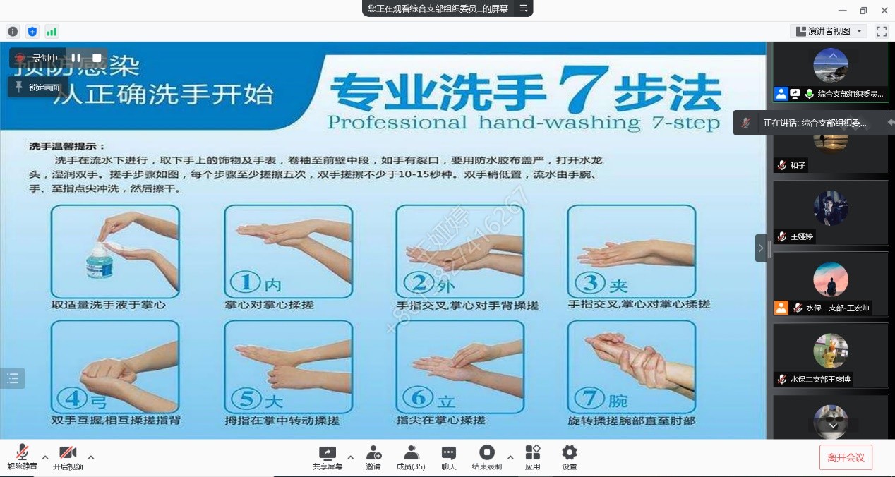 结合支部特点,校医院综合党支部公卫科主任张伟介绍了疫情防控和新冠疫苗接种相关知识,从国家卫健委对常态化疫情防控的工作要求到接种疫苗的意义和注意事项等方面,生动形象地教学了专业洗手7步法来帮助与会党员增强卫生意识。