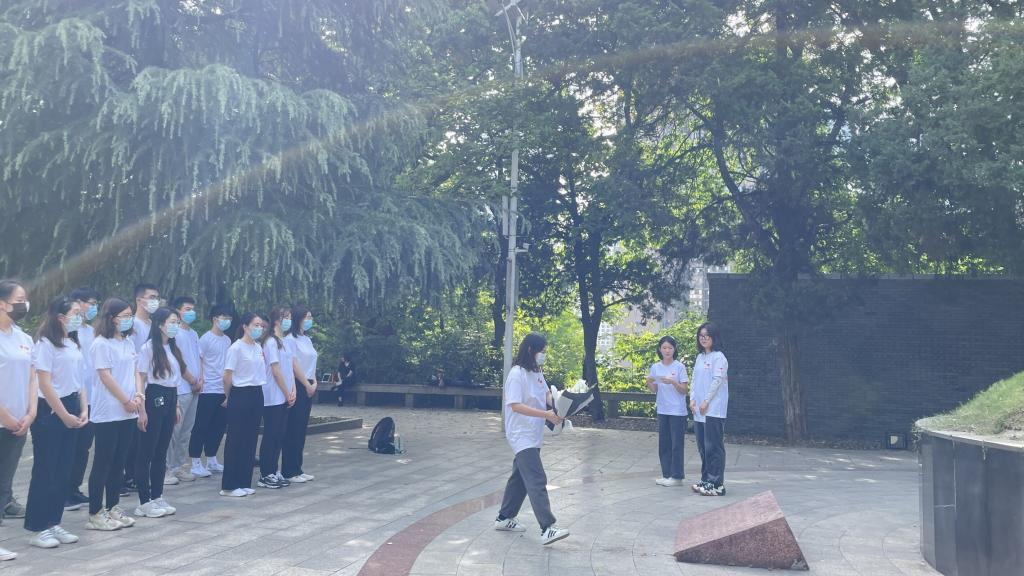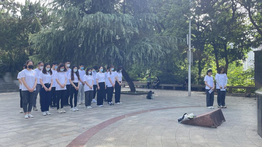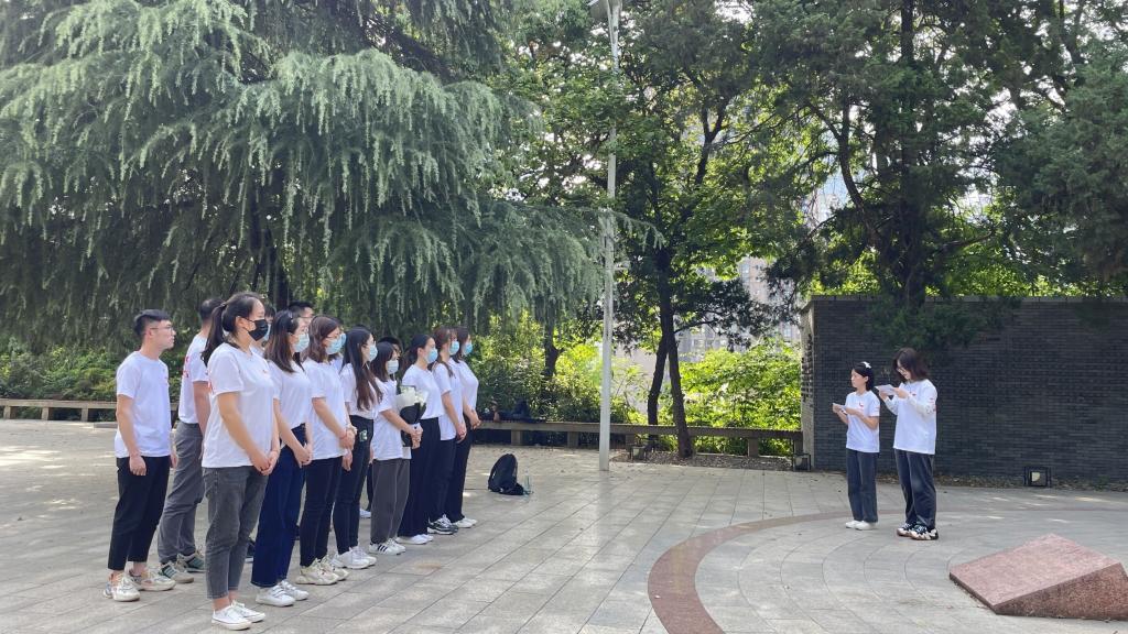 随后,大家一同前往施洋烈士陵园,瞻仰缅怀革命先烈,学习了解革命历史。施洋烈士陵园主要由施洋烈士塑像、纪念“二七”惨案的27级台阶、纪念碑和施洋墓组成,为纪念因京汉铁路大罢工而光荣牺牲的律师施洋而修建。在施洋墓前,学员蔡青青、孙雨欣讲述时代背景及施洋烈士生平,学员代表张紫荆为烈士鲜花,全体学员绕墓一周寄托哀思并在墓前肃穆默哀。默哀结束后,胡志宏分享了约翰·亚当斯的名言:“我必须研究政治和战争,这样我的儿子们才会拥有研究数学和哲学、地理、博物、造船、航海、商业和农业的自由,他们的孩子才能拥有研究绘画、诗歌、音乐、建筑、雕塑、织艺和陶瓷的权利”。他说,这段话直接而清晰的讲明一代人有一代人的担当、一代人有一代人的使命这个道理,以施洋烈士为代表的前辈们完成了他们的使命,历史的接力棒不可更改的交到了我们手中,希望此次主题团日能淬炼大家“请党放心、强国有我”的豪情与担当。