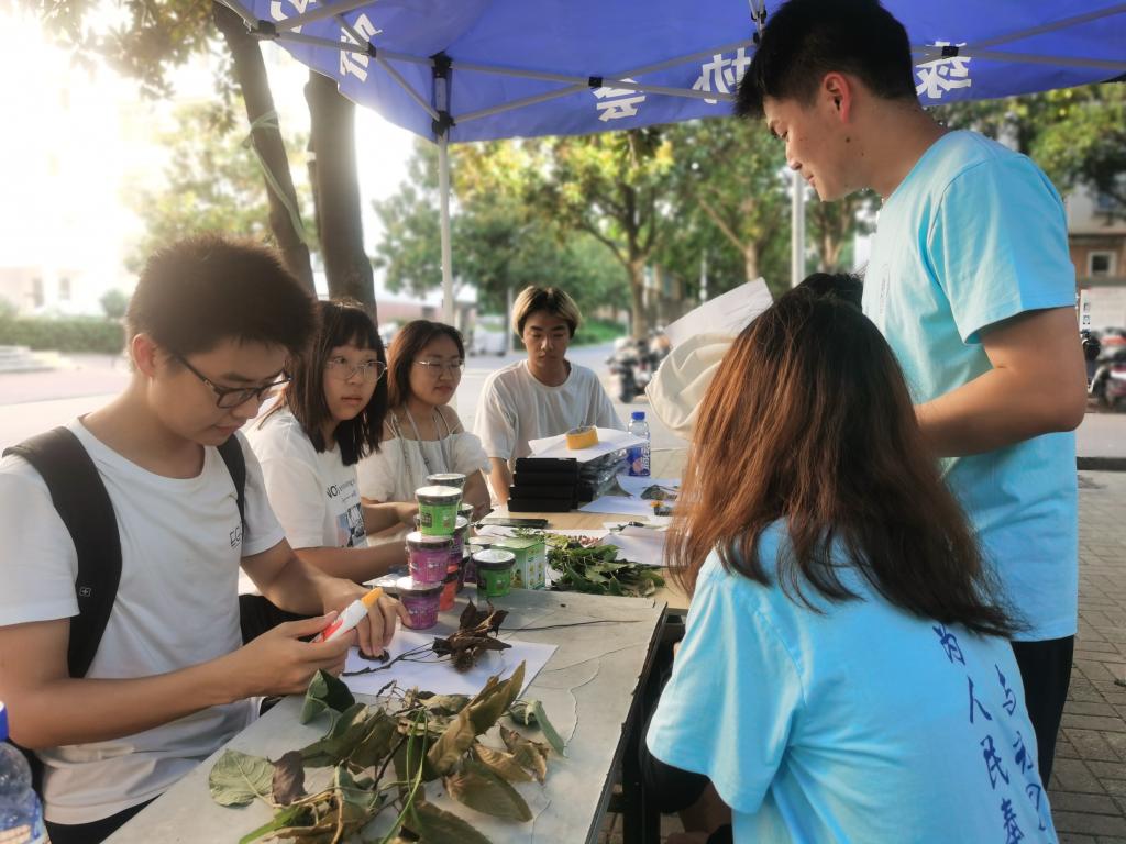 植物科学技术学院两名研究生来到摆点帐篷前,拿起桌上植物进行剪贴画的制作。“之后你们可以拍摄有关生态环境保护的小视频进行宣传”,活动结束后,他们将制作好的剪贴画赠送给团队成员,并对团队宣传工作提出建议。