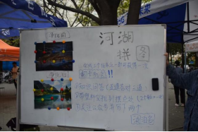 公宣活动紧扣主题,设置了知识问答、收集塑料瓶等游戏任务,并制作了翻转拼图墙。参加活动的同学完成任务将有机会将治理前湖泊的拼图翻面,进而拼成净化后的湖泊照片。在同学们的接力下,治理前的照片一点点被翻开,湖泊本来的样子也逐渐展现在大家眼前。