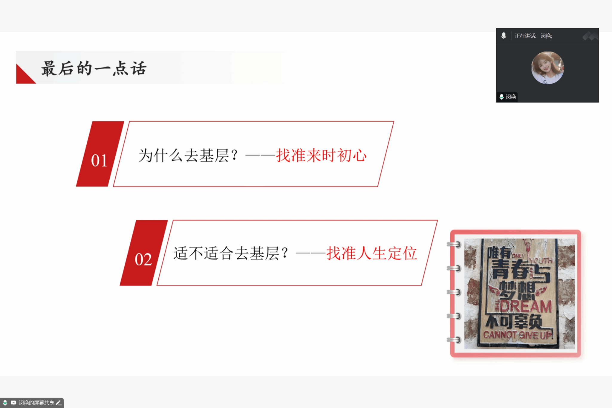 三位校友围绕基层工作内容、干部成长支持体系、工作心得感悟与复习备考建议等内容和同学们进行交流并解答了大家的疑惑。