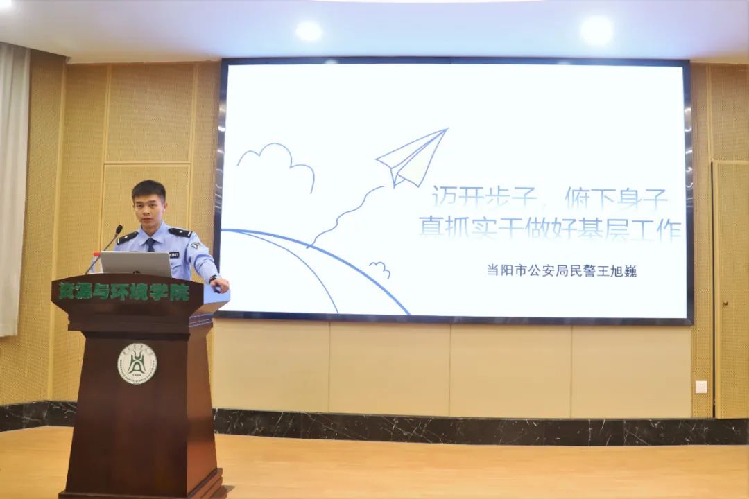 活动伊始,王旭巍以诙谐幽默的语调将基层工作环境与华农校园环境作对比,吸引了同学们的注意力。之后从“公考”、“机关所队初体验”、“乡镇派出所基层生活”和“基层生活感悟”四个方面阐述了本次分享会的内容。王旭巍学长在分享的同时,以穿插基层生活小视频和运用网络热梗的方式,充分调动了分享会氛围,生动形象的为同学们展示出一个饱含酸甜苦辣、“爱恨情仇”的基层生活。