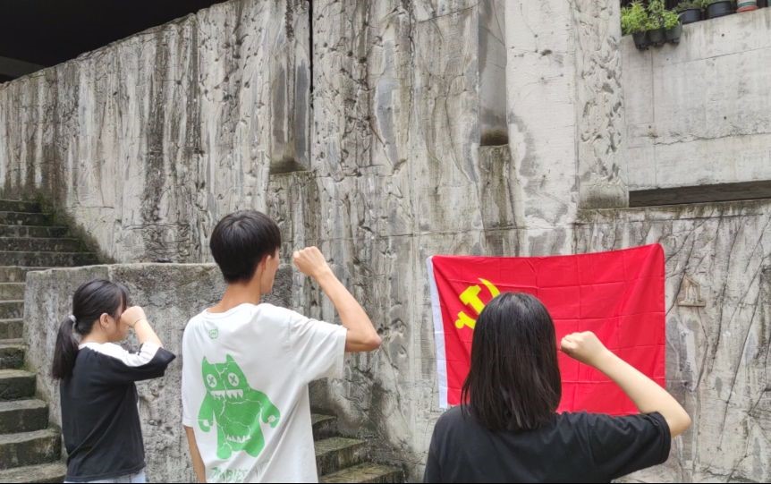 离开展示馆,小组成员来到展示馆附近抗战碉堡遗址,组内党员佩戴党徽面向党旗,重温入党誓词,再一次坚定中国共产党员为人民群众奉献一切的理想信念。
