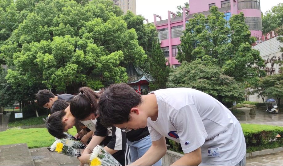 礼毕,小组成员手捧鲜花,在淅沥小雨中慢步走上台阶,向纪念塔三鞠躬,敬献鲜花,从右向左绕纪念塔缓行一周,以此寄托哀思。