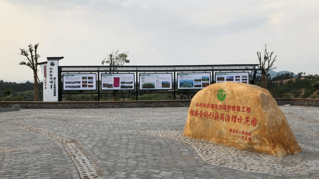 据讲解员介绍。2014年12月赣州列为全国水土保持改革试验区,该市抓住重点领域和关键环节,先行先试、大胆创新。2015年编制了《赣州市崩岗防治规划》,提出连片开发、系统治理。2016年开始,将赣县、兴国、于都等地连片崩岗群纳入山水林田湖草项目实施,采取生态修复型、开发治理型、治理提升型等多种治理模式,削坡修筑梯田,优化坡面水系布局,系统配置林草防护措施,做到崩岗治理与农林开发相、乡村旅游相、精准扶贫、落实管护机制“四结合”,治理崩岗4300多座,让崩岗长了青树、换了新颜,打造了南方崩岗治理示范样板。