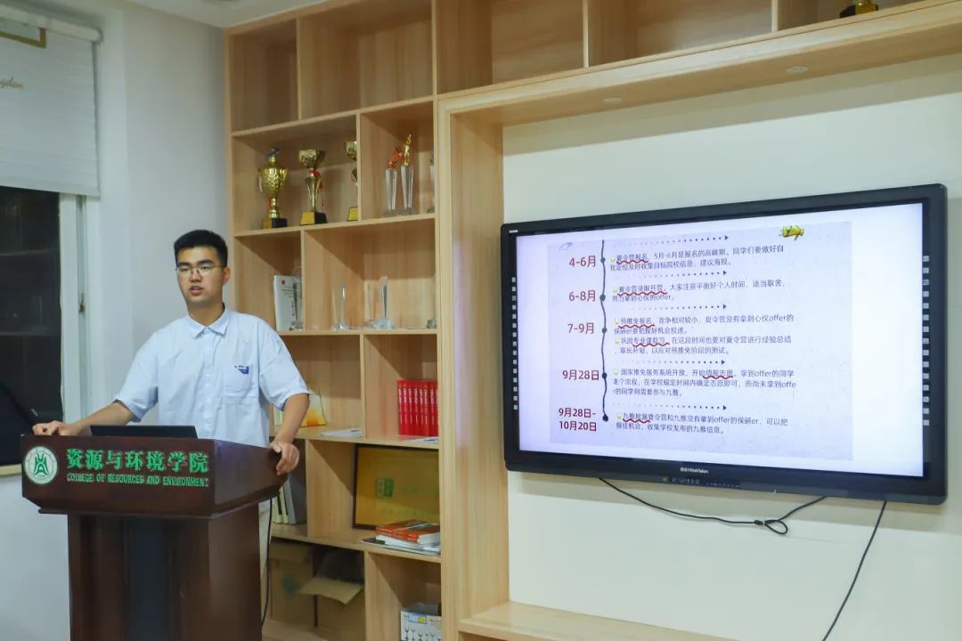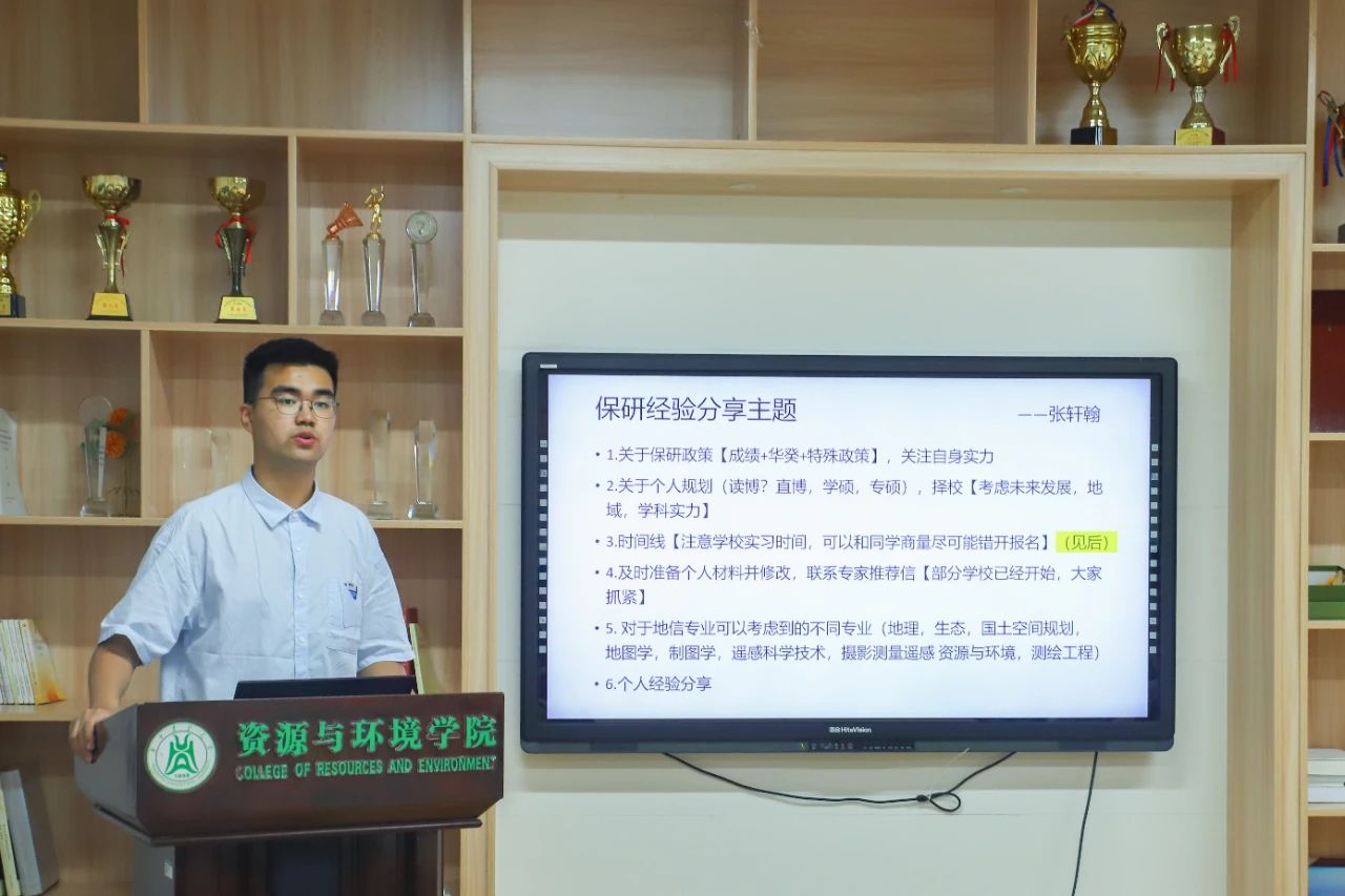 地信2001班张轩翰已保研至武汉大学。他首先介绍了“成绩”保研、“华癸”保研、“2+2辅导员”保研、“研究团”保研等途径。他认为同学们应当关注自身实力考虑后续发展,如果成绩位于专业35%以外(民族班放宽到45%)可以考虑考研和直接就业。相较于学硕,报名专硕的风险大、压力大,但由于学制是两年可以尽快就业。关于择校,他建议主要考虑地域和学校的学科实力两个因素。接下来他带大家捋清了保研的时间线。“现在正是夏令营报名的高峰期,同学们要做好自我定位及时收集目标院校信息,建议海投。”他说道,“被夏令营录取后适当取舍,如果没有被夏令营录取可以在寒暑假期间进行预推免报名和巩固专业课复习。9月28日开始填报志愿,未拿到录取通知书的同学要把握机会参与九月正式推免。” 此外,他针对根据相近专业可以考虑到不同专业,如地理、生态、测绘工程、遥感科学技术等。最后联系到自己的经历,他说:“想要被录取到心仪的学校,专业排名靠前的同学可以在夏令营时多尝试,不那么靠前的同学在预推免的时候要更加努力。”