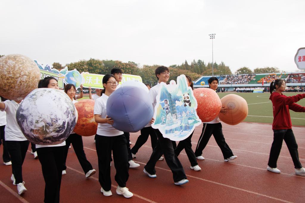 本次学院开幕式方阵由40位学院学生与全体教职工组成,师生们迈着整齐步伐,从主楼出发,步履昂扬,神采飞扬。率先入场的是捧着九大行星的几位同学,象征着人类对宇宙的探索精神,而“人与自然和谐共生”的图画,则倡导了可持续发展的理念,这一组合,不仅传递了对宇宙自然的敬畏之心,更呼吁人们关注保护环境,构建美好家园的愿景。经过主席台时,nba88看球 师生高喊“资环多壮志,奋力争荣光”,为nba88看球 运动员加油助威。