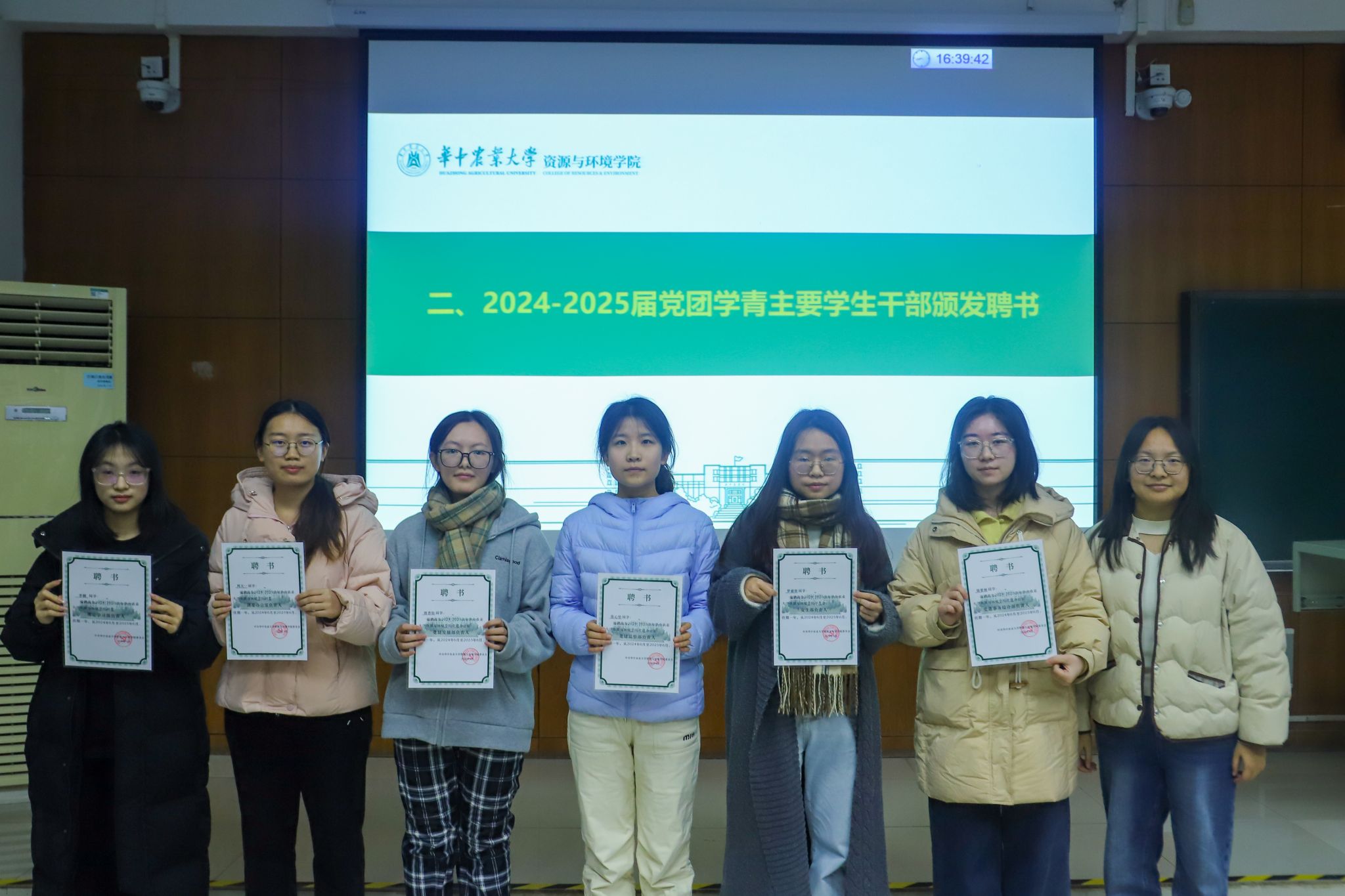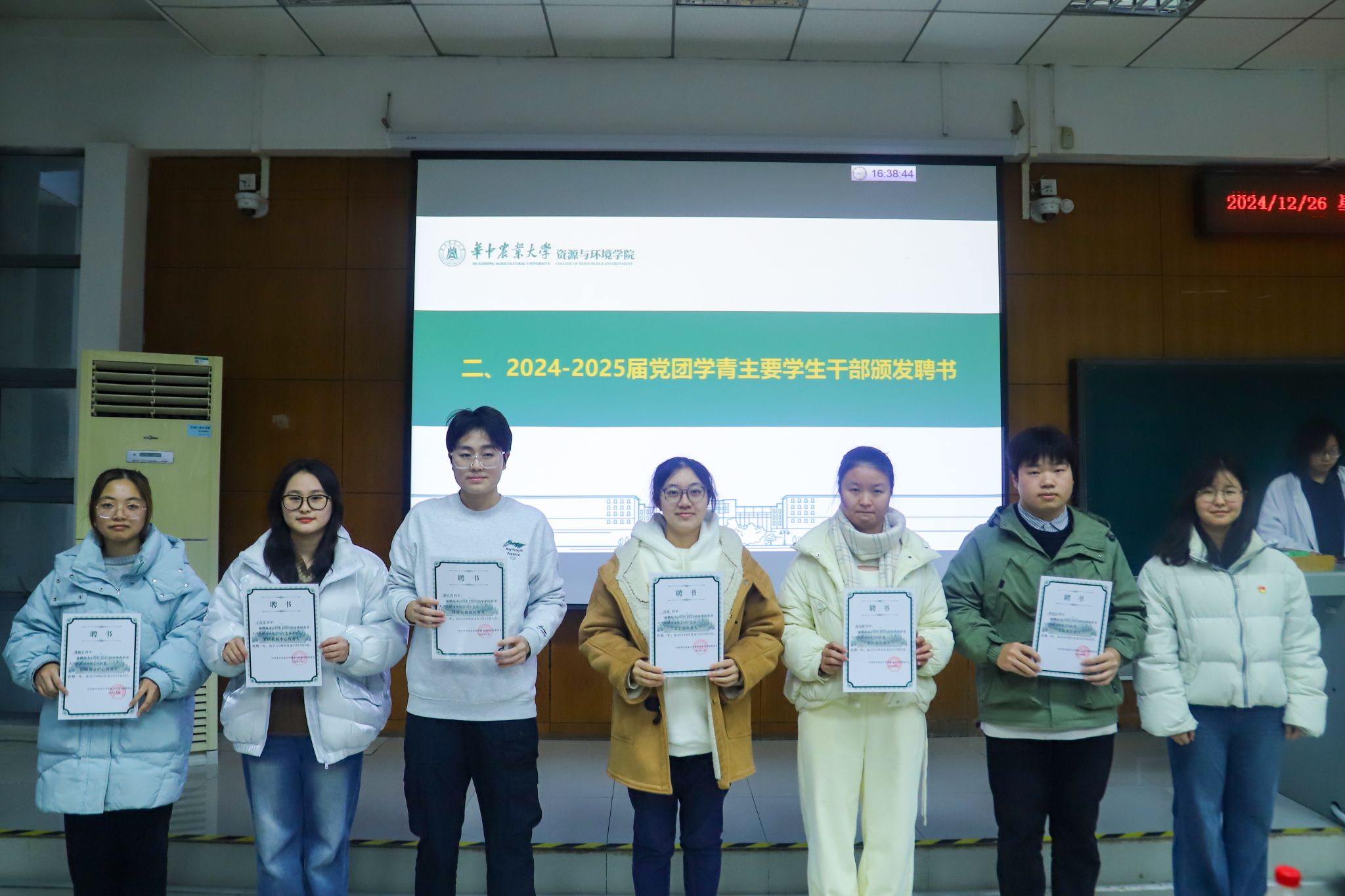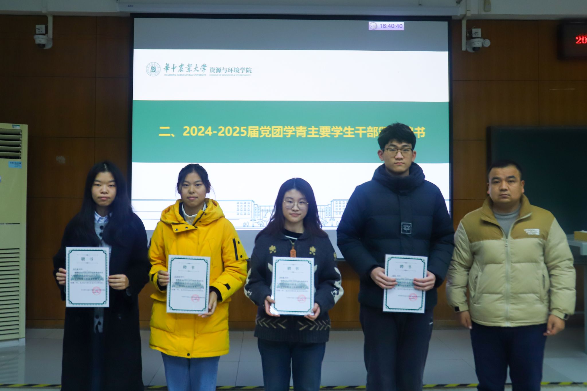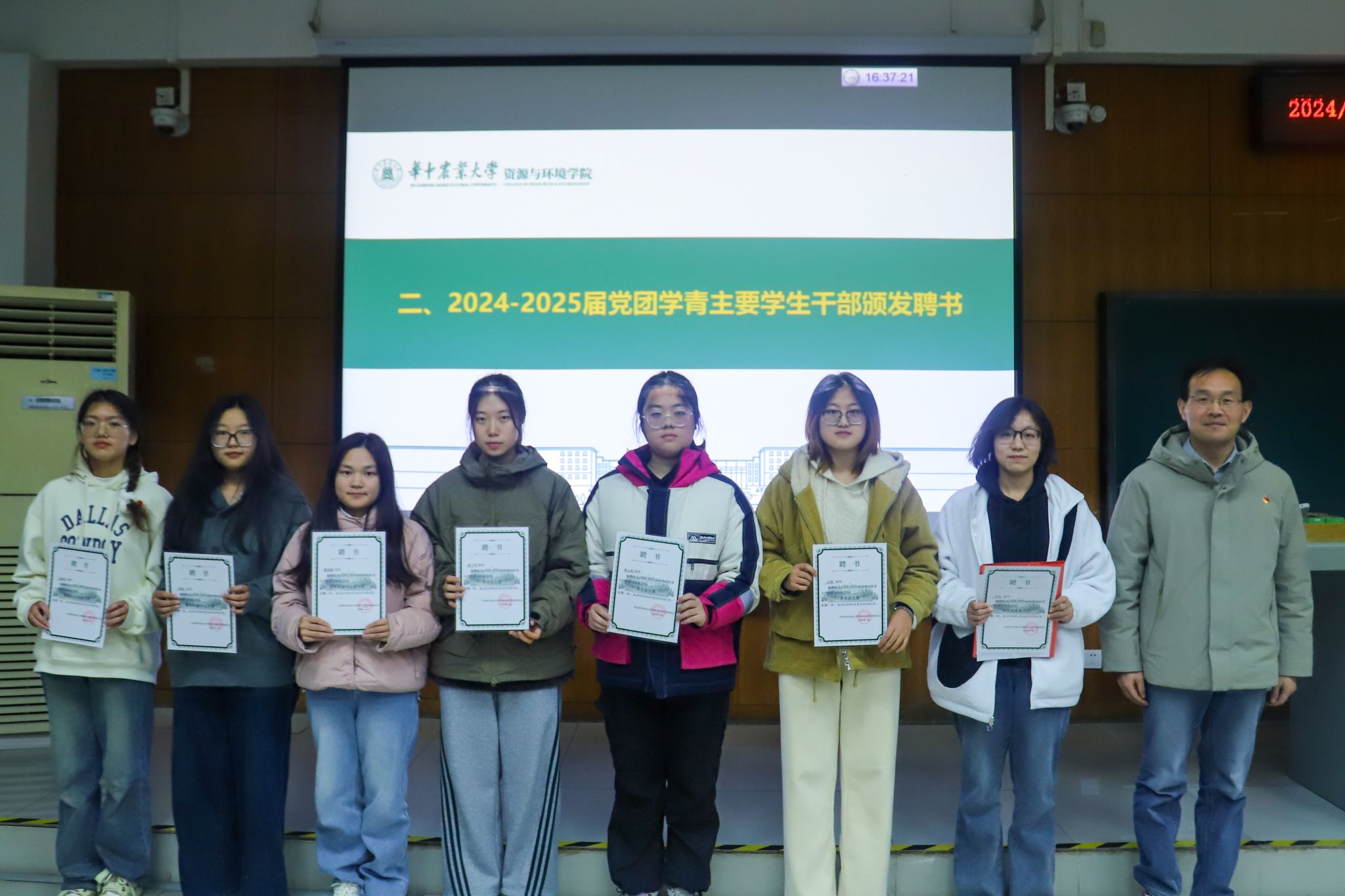 会议开始,江庆介绍了2024-2025届党团学青招新情况。自今年5月25日党团学青组织换届大会开始,nba88看球 共聘用学生党团学青主席团共7人,同时选拔出了22个优秀学生成为了nba88看球 下设的学生组织各部门的负责人。后续通过各项面试,共有98名同学成为了部门工作人员;从24级学生中选出了105名优秀的学生成为了各部门的志愿者。最终于11月底形成了共包含232学生的新一届2024—2025学生干部组织。并为2024-2025届党团学青主要学生干部颁发聘书。