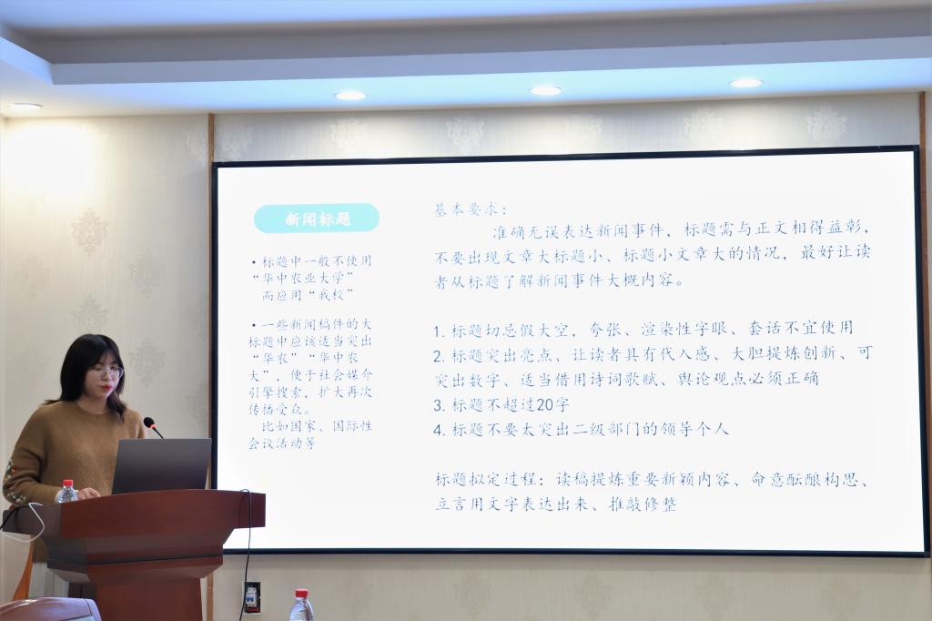 “一篇好的新闻,一是读者能够从新闻中得到知识和信息,二是读者能够从中得到乐趣。”鲁艺冰首先从新闻价值分析出发,分析了新闻的主要特点,并对新闻价值的五要素进行了详细的讲解。而对于新闻点的挖掘,鲁艺冰说道:“记者,不仅仅在于记录,更要带着善于发现的眼睛和勤于思考的头脑去采访,才能挖掘出好新闻。”此外,对于不同的新闻稿件类型,不同类型新闻稿的写作规范,鲁艺冰也从细节出发,做了详细的讲解。最后,她谈道:“我们都应该去寻找到自己作为一名新闻工作者的乐趣所在,为学校学院的新闻宣传工作做出自己的贡献,找到自己在新闻工作中的价值所在,坚持在新闻宣传的道路上不断前行。”