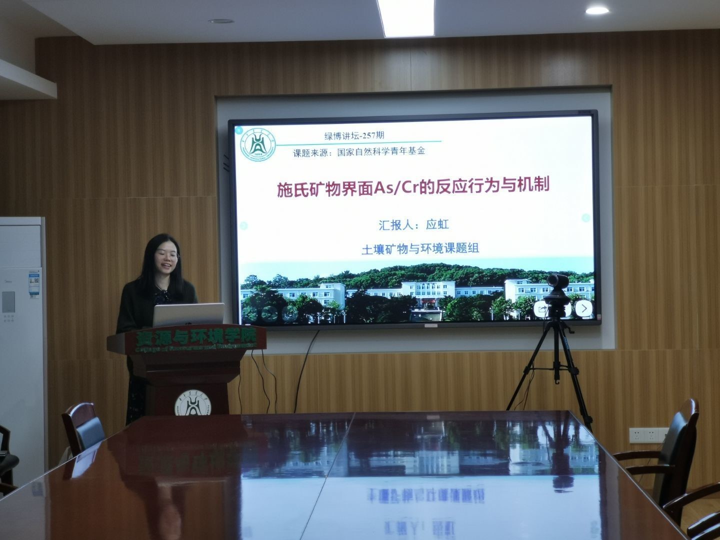 4月28日19:00,学院第257期绿博讲坛在主楼315会议室进行,2021年研究生国家奖学金获得者、学院2018级博士生应虹以“施氏矿物界面As/Cr反应行为与机制”为题和大家进行了学术分享。