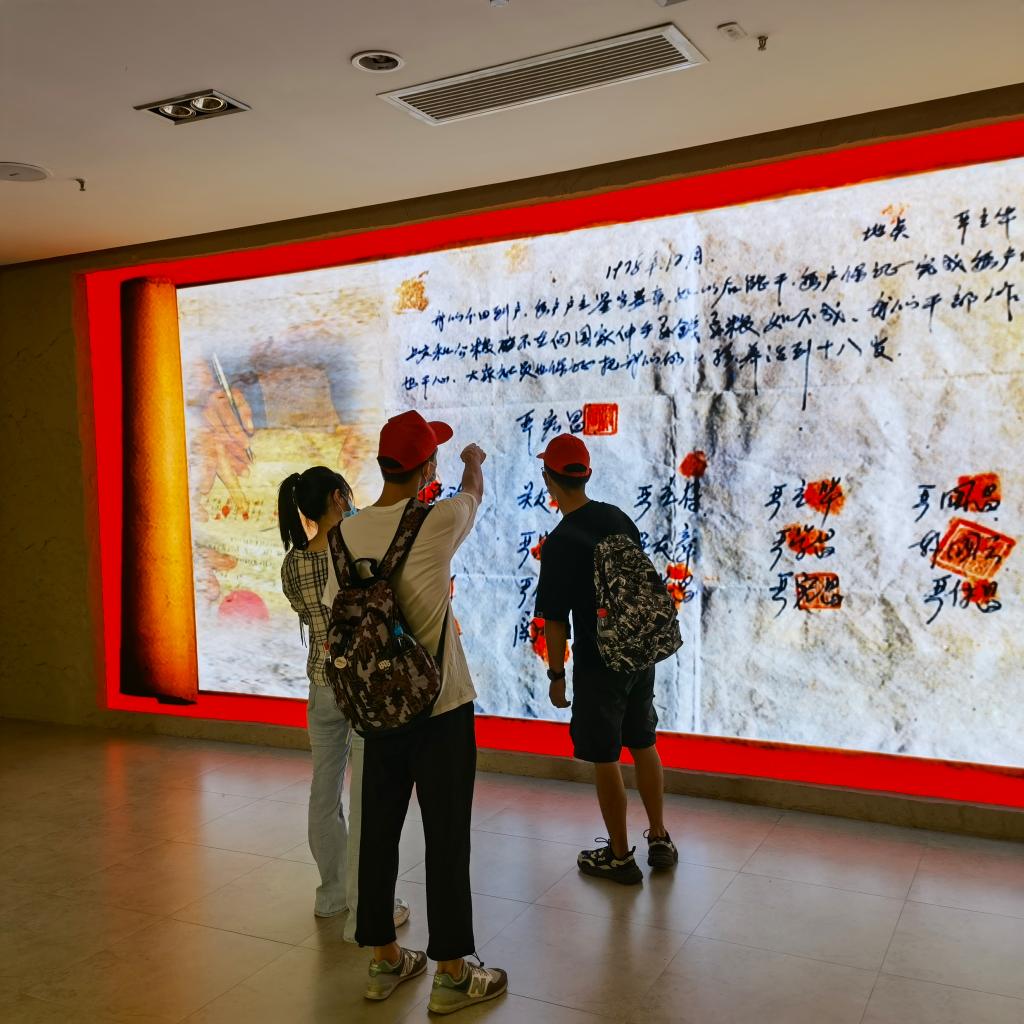 走进大包干纪念馆,首先映入眼帘的是当年18个红手印的展板,鲜红的手印仿佛穿越历史时空隧道将同学们的目光带向1978年小岗村的那个夜晚:昏黄的灯光下,18位农民神情严峻地立下“生死状”,在一张秘密契约上一一按上自己鲜红的手印,签订大包干契约。由此,家庭联产承包责任制迅速燃遍中国大地。纪念馆内,实践团队成员跟随讲解员的步伐,通过一段段文字、一张张图片、一个个场景,立体、丰富的了解当年大包干从酝酿到发生发展的全过程,体会大包干对农村改革发展的重要意义。 “作为农学专业学生,乡村振兴是我们的使命、广大农村是我们的天地,我们也应该发扬勇于创新,敢为人先,为美好生活不断奋斗的大包干精神”,参观完后,团队成员孟孜贞说到。