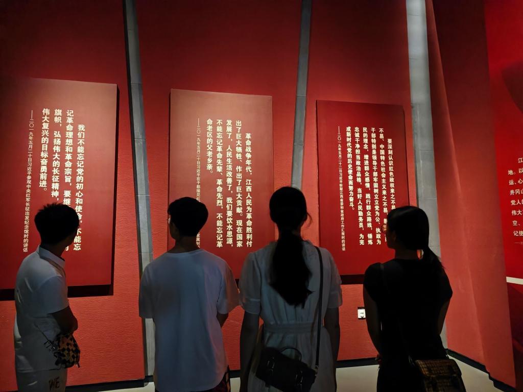 31日,实践团成员来到江西省博物馆学习。江西是革命星火燎原地,共产党人初心使命的源头,也是“新长征再出发”的号角吹响地,孕育了伟大的井冈山精神、苏区精神、长征精神,被习近平总书记誉为 “一片充满红色记忆的红土地”。团队成员对江西古代历史文化展、江西革命史陈列两个展厅进行重点学习。红色主题馆展示了从1919年至1949年三十年间中国共产党领导下的江西革命斗争史,贯穿两条主线:中国共产党在江西红土地上为寻找中国革命新道路的艰苦探索,江西人民为中国革命作出的巨大贡献和牺牲。展览共七大部分:曙光映照、军旗升起、星火燎原、红色中华、浴血坚持、抗日烽火、迎接解放,以时间脉络串联历史事件,将专题与历史时序相结合,展现江西作为中国革命、人民共和国、人民军队的摇篮和中国工人运动的策源地的重要地位,致敬伟大的井冈山精神、苏区精神、长征精神。团队成员在观看展览后,深受感动,通过电子献花,表达对革命烈士的崇敬之情。
