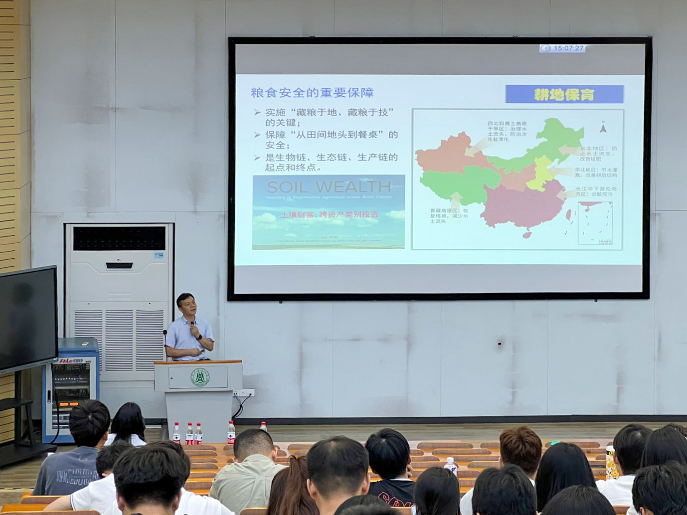谭文峰老师以“聚焦四个面向,致力环境保护和绿色发展”为主题与研究生新生分享农业绿色发展理念和土壤环境学科历史与前沿,引导新生将学科专业研究与国家战略需求相结合,不断向科学技术广度和深度进军。“要以人与自然和谐为价值取向,以绿色低碳循环为主要原则,以生态文明建设为基本抓手,其中最核心的就是人与自然和谐发展。”谭文峰老师指出农业生产的核心就是绿色循环的过程,只有健康的土壤,才能有健康的环境和健康的食物,才能有健康的人类,建议同学们将人类经济活动过程和结果的绿色化、生态化作为绿色发展的核心内容和途径,围绕绿色生态为主导来开展研究。