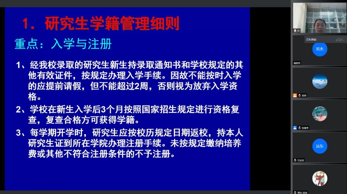 胡志宏老师从管理人员、管理架构、疫情防控、规则纪律、奖助工作等方面介绍了研究生日常教育管理的内容。新阶段、新精彩,他期待同学们学会在独立自主中激扬青春、成就自我。