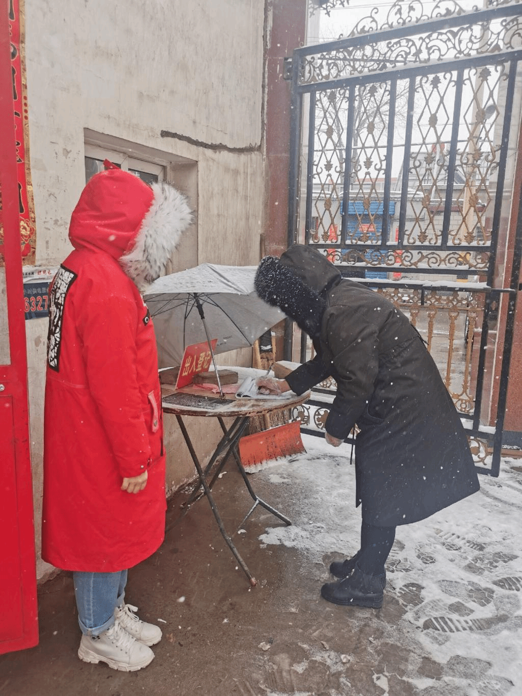 2月27日,大雪纷飞,在江西省寿阳县内的一个小区门口,环工类1906班的李艳峰肩戴红丝带,佩戴口罩,正在为出入小区的人员做登记。她的主要任务就是负责小区人员流动的登记,严格检查出入证并测量体温。
