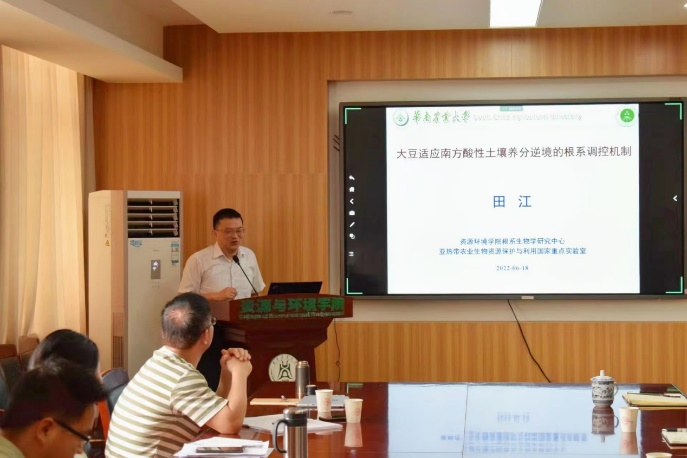 6月18日上午,华南农业大学资源环境学院副院长、亚热带农业生物资源保护与利用国家重点实验室课题组长、根系生物学研究中心田江研究员和华中农业大学植物科学技术学院杨万能教授应nba88看球 丁广大教授邀请参加第16期资源与环境青年创新前沿论坛,与华农师生一起探讨了南方酸性土壤中大豆适应养分逆境的根系调控机制和作物表型组技术方面的最新研究进展。论坛由丁广大教授主持。