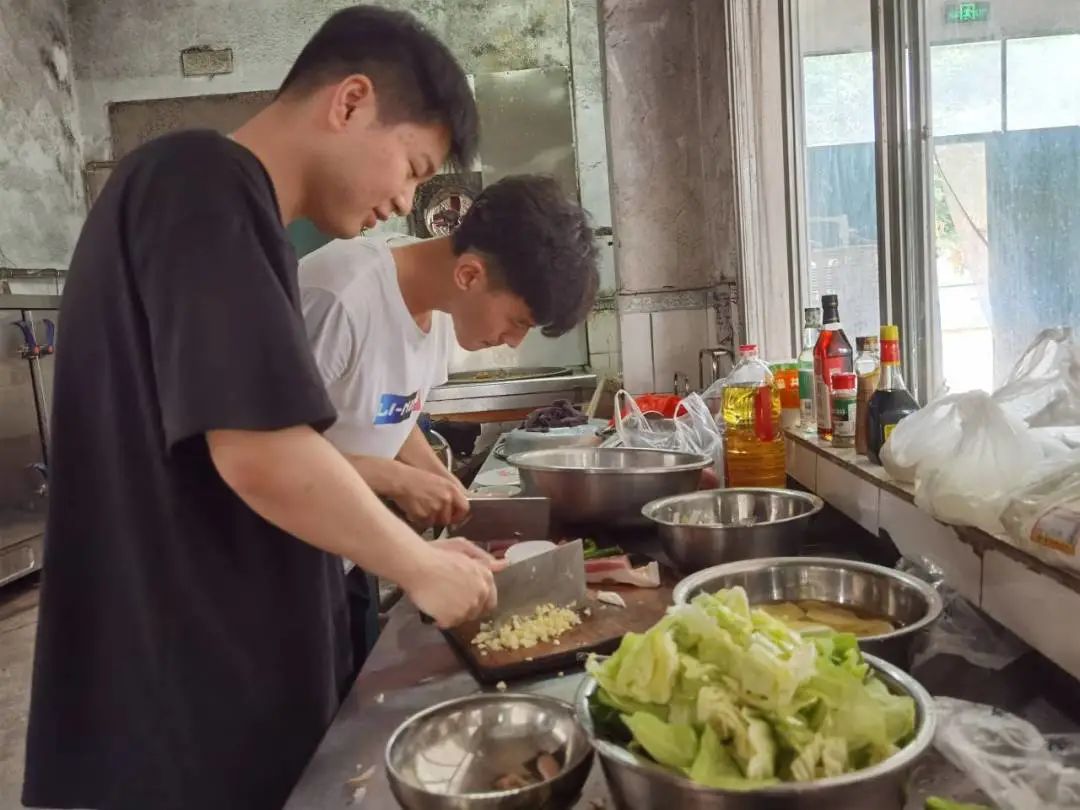 对步前小学樟坑教学点的支教一如既往。考虑到樟坑教学点环境简陋,今年将支教点从樟坑村学改到了步前小学。说话间,邱荣福带领我们来到学校的厨房。四个队员洗菜的洗菜、煎蛋的煎蛋,忙的正欢。