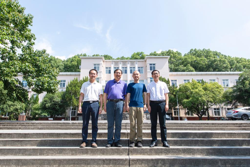 廖国瑞校友与导师蔡崇法教授等在学院前合影(记者 刘涛 摄)