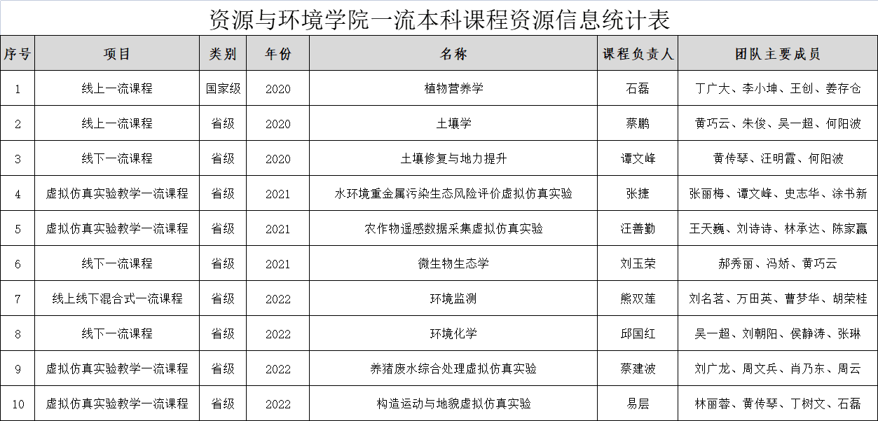 12月6日,湖北省教育厅公布2022年度省级一流本科课程认定结果的通知,nba88看球 四门课程入选,其中《环境检测学》为线上线下混合式一流课程,《环境化学》为线下一流课程,《养猪废水综合处理虚拟仿真实验》和《构造运动与地貌虚拟仿真实验》为虚拟仿真实验一流课程。 目前学院共有国家级一流本科课程1门(《植物营养学》,线上一流本科课程)、省级一流本科课程9门。