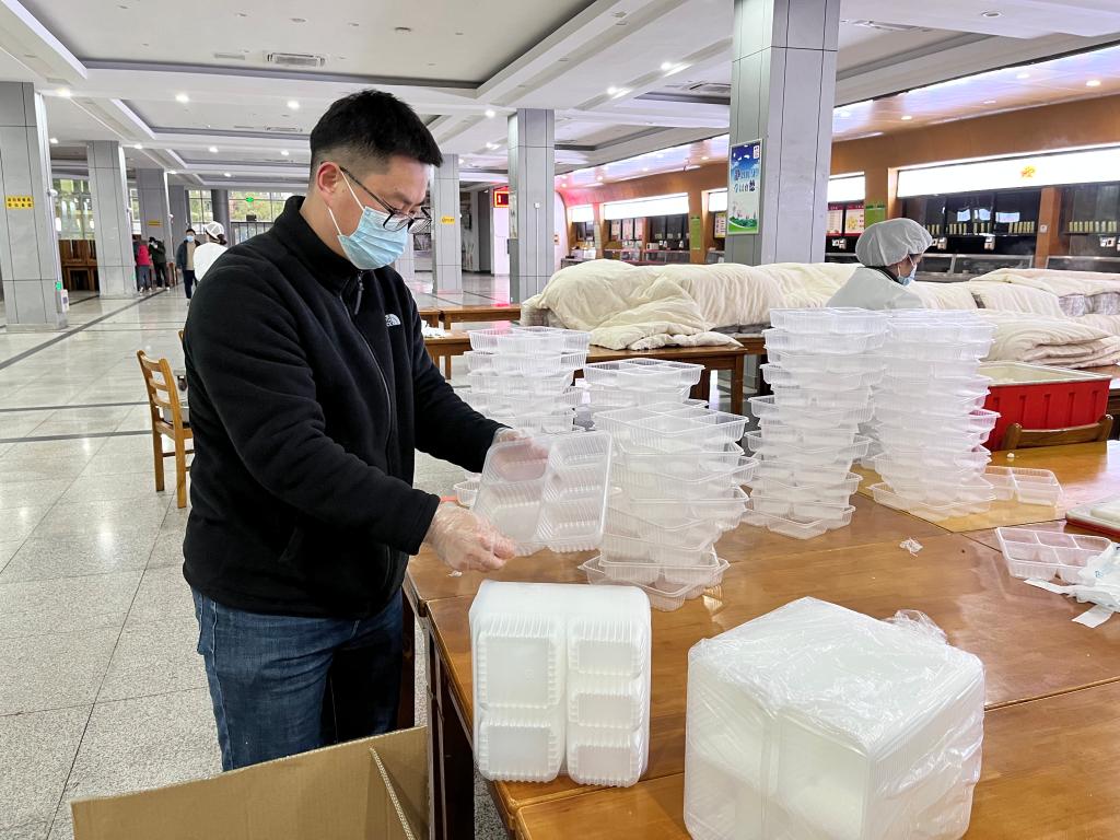 静默不停学,静默不停教。教师们通过线上办公线上上课确保教学工作的有序开展,线下投入后勤保障和值守工作,为学生发放生活物资。在接到志愿者招募通知之后,褚琳老师被安排到荟园分装盒饭,“为了保障学生能吃上热饭暖菜,大家齐心协力,一上午的时间顺利打包完成了450份盒饭,咱学校真的是在最大程度的保障学生健康与安全,处处以学生为中心,身为华农人,很骄傲!”“没想到装盒饭这么麻烦,那天上午我们六个人一个小时才装了300份,都想赶紧让同学们吃上热饭”,郭龙老师回想起当时热火朝天的情景,所有人都精力高度集中,像在食堂里完成一场高难度实验。“我只是做了一点点应该做的事。回头来看,我们老师能做的其实有很多,不仅仅是后勤保障,在安抚学生情绪、如何提高线上教学的学习效率、如何保证研究生的课题任务顺利进行等各方面都需要做好“服务””,回想起来,朱强老师认为自己能做的应该更多。苗洁老师说,“当时食堂缺人手,后勤人员凌晨就起来炒菜,我便与其他四位老师赶过去帮忙打包”,身为党员的她坚信病毒无情,人有情,无论是教师还是学生,都应该在面对考验时挺身而出,体现华农人的担当。