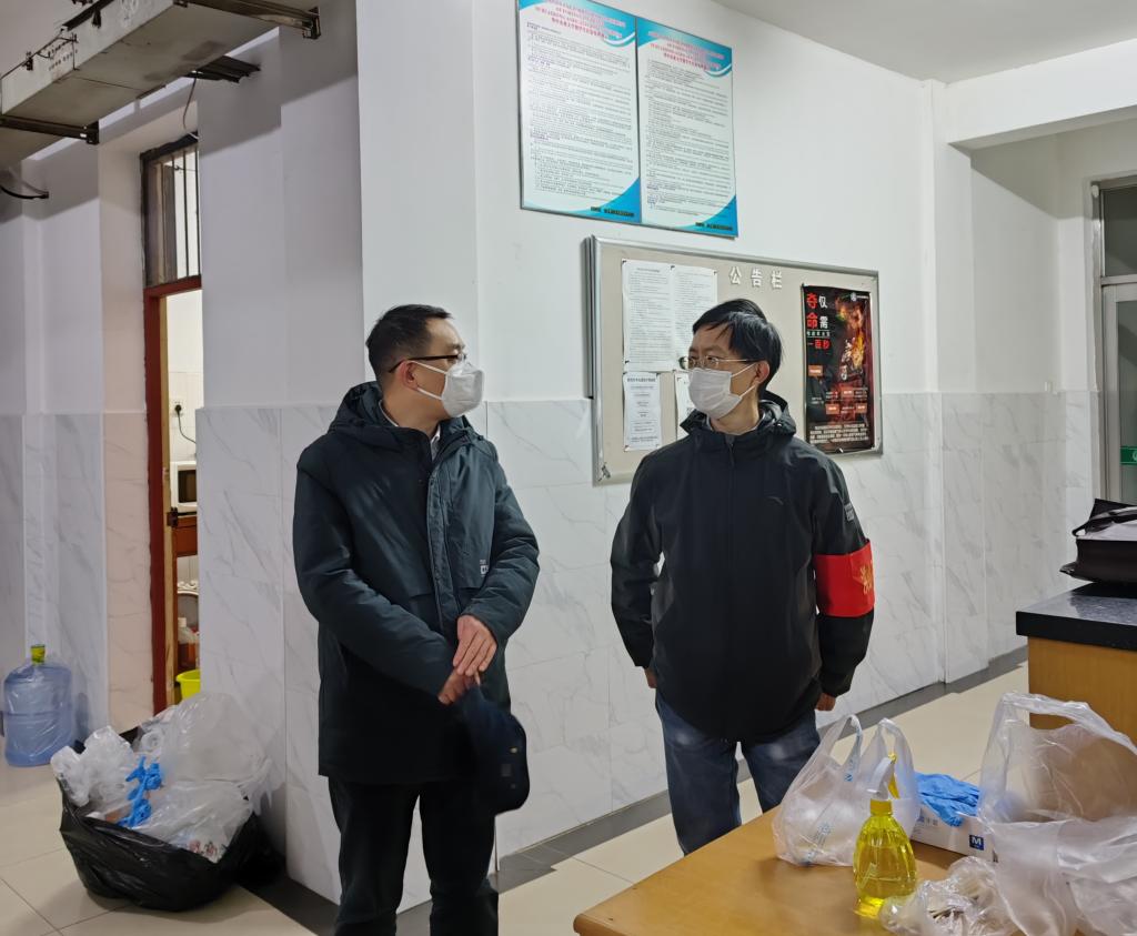 在宿舍区,耿明建、戴珂等老师在寒风中穿行,协助医护人员为楼栋学生开展核酸检测、分发医药品,处理突发状况。老师们主动轮流值守,号召楼栋内中、外学生志愿者有序接餐和送餐到宿舍门口。在耿明建老师看来,疫情就是命令,作为共产党员,理应在校园疫情防控阻击战中走在前面,为师生健康和校园平安做出贡献。在学院院楼和办公区,丁忠、陶艳红等老师昼夜坚守,清理实验区,排除安全隐患,开展困难教职工的帮扶工作,守护师生平安。