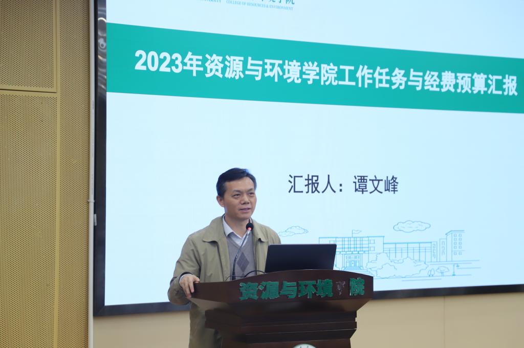 院长谭文峰向会议代表报告2023年学院主要工作和经费预算。2023年学院工作总体思路以习近平新时代中国特色社会主义思想为指导,立德树人为根本,师资队伍建设为重点,团队建设为突破口,耕地质量提升、农业农村环境治理为核心,重点建设野外观测站,着力推动生态环境与绿色发展交叉学科发展。2023年学院主要工作为全面学习落实党的二十大精神,开展习近平新时代中国特色社会主义思想主题教育,申报全国样板党支部,深化人才培养模式改革,加强一流专业课程教材建设,开展环境工程专业工程教育认证,推进农业农村部观测站建设,加强“十四五”湖北省优势特色学科(群)建设,推进生态环境与绿色发展交叉学科建设,举办生态环境与绿色发展高端论坛,立项资助6个科研团队、9个教学团队,加强学院文化建设等。谭文峰汇报了学院工作的经费预算情况。