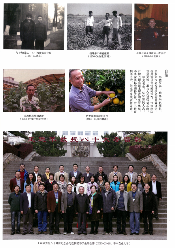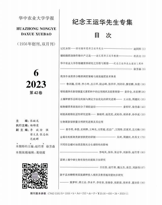 王运华先生是我国知名学者、植物硼营养研究专家、华中农业大学原副校长(1990-1995)。先生一生致力于我国农业科技事业的发展和人才培养,一生笃行农业科研要为农业生产服务的理念,用一生诠释了“生命不息,科研不止”。在先生仙逝周年之际,《华中农业大学学报》编辑部和王老师的弟子们共同策划了纪念专集,共刊载文章24篇。