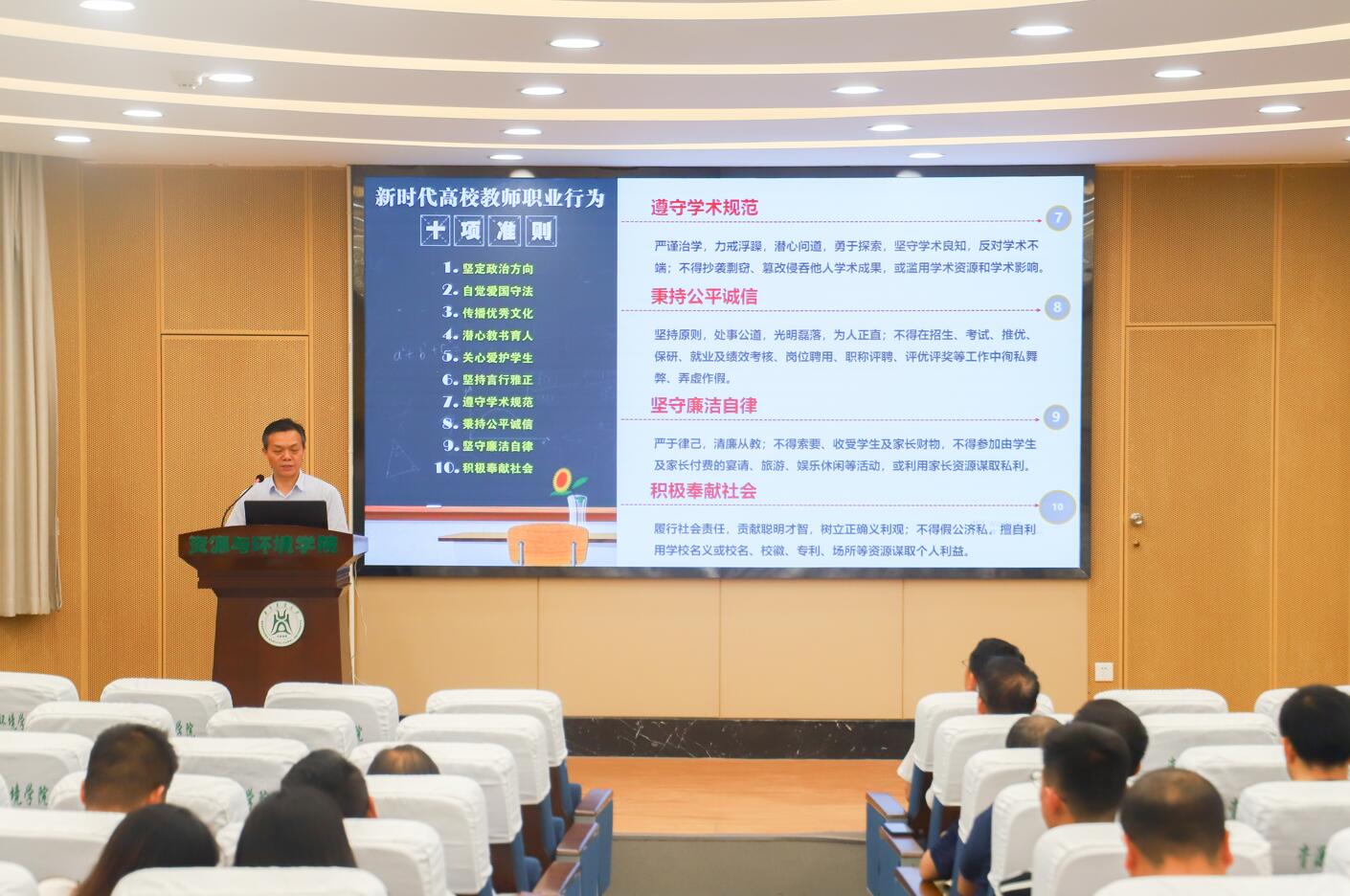 院长谭文峰面向全院教职工开展师德师风集中教育,他围绕习近平总书记关于师德师风的重要论述、高校教师师德师风标准、高校教师师德典型代表、高校教师师德失范案例等内容进行宣讲。谭文峰强调,教师应以“四有好老师”、“四个引路人”为标准,以《新时代高校教师职业行为十项准则》严格要求自己,向黄大年、李保国、傅廷栋等优秀代表学习,做“四有”好老师,争当时代“大先生”。