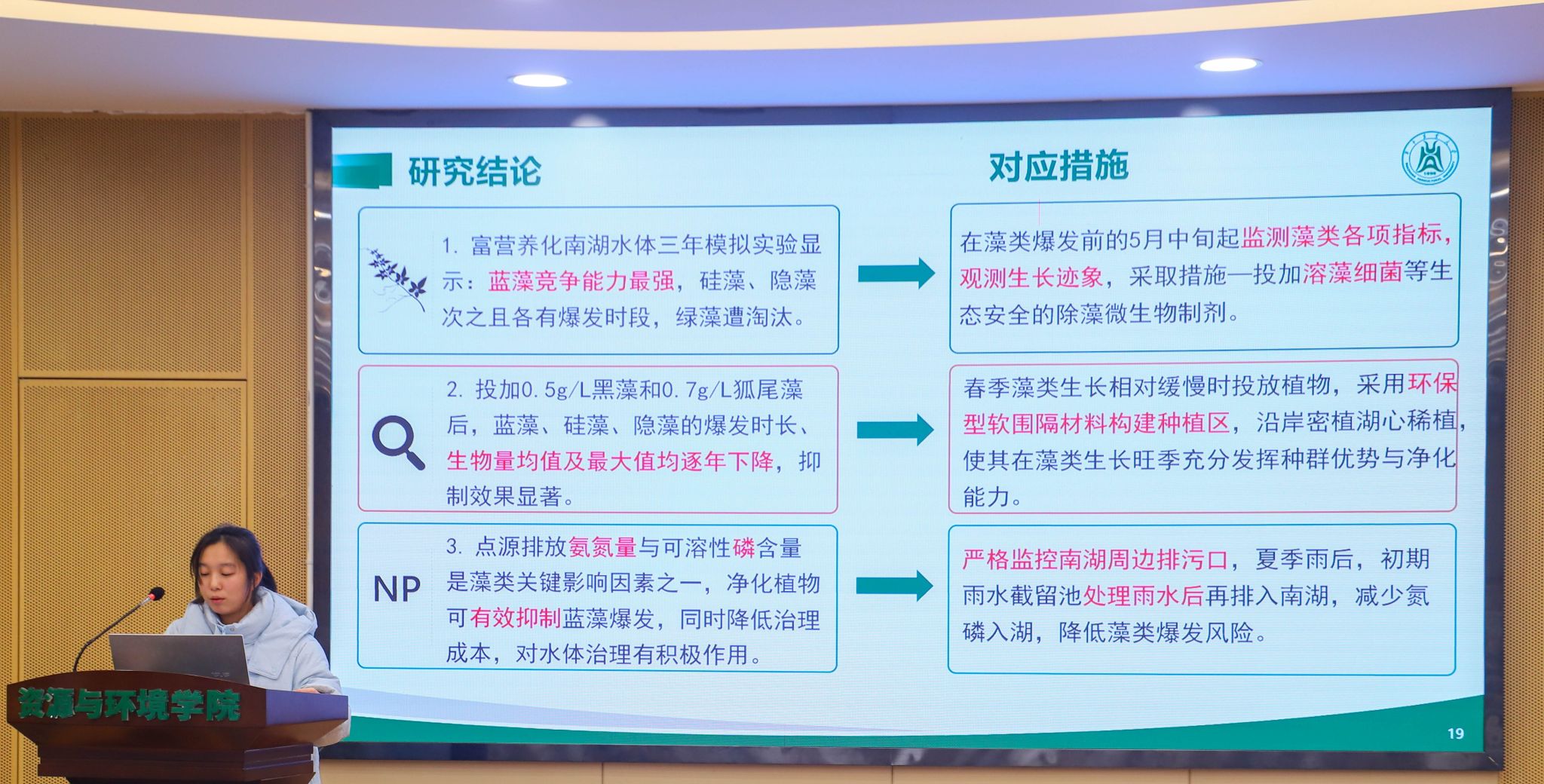 “一种活性炭生物膜法处理洗浴废水的系统设计”团队运用连通器原理控制浸没的水量,搭建出了简易的反应系统,使废水处理的过程具象化;基于我校生态浮床治理南湖水质已有的技术基础,“反硝化聚磷菌与生态浮床结合治理南湖富营养化”小组结合反硝化聚磷菌的调查和分析,提出了一种能够提高生态浮床对富营养化水体中磷元素去除效率的措施,以更好治理南湖的水体富营养化;“基于海绵城市理念下的宿舍区雨水综合治理”小组则观察并联系生活中雨水大量滞留的现象,通过深入探究和调查,设计出了荟园宿舍区一套单独的雨水处理系统,以此来应对暴雨时雨水难以及时快速排出的问题。