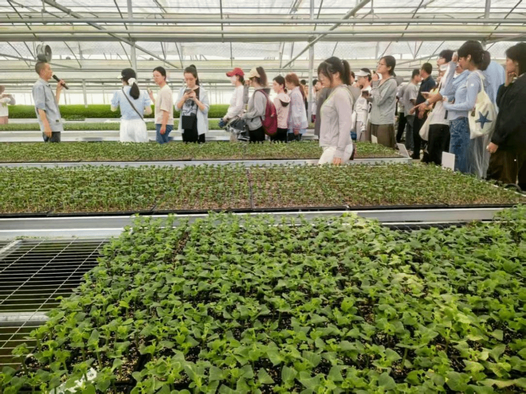 7月8日,实习团队将视角转向农业生产终端与科技应用场景。上午,双井村的设施农业基地成为首站——在西瓜优质轻简化栽培示范基地,标准化种植流程与节水灌溉系统让同学们直观理解“轻简化”的实践意义;育苗大棚内,全自动播种机、恒温控制系统等机械化装置高效运转,展现出现代设施农业的智能与高效。