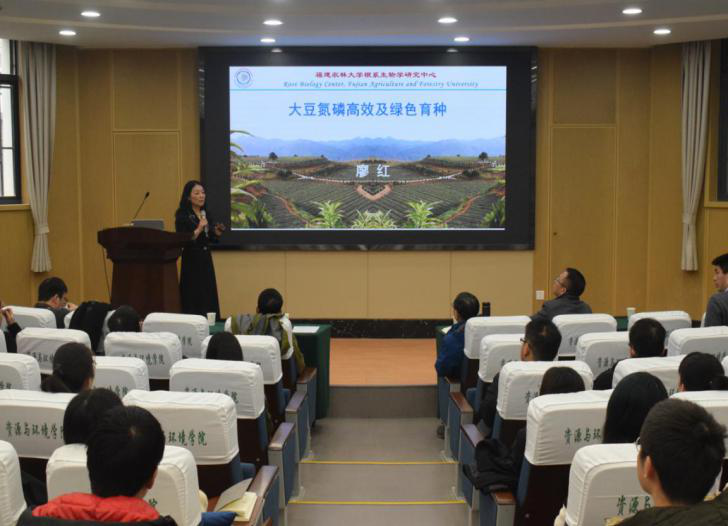 十九大代表、中国青年女科学家、福建农林大学海峡联合研究院廖红教授上午首先带来了题为“大豆氮磷高效与绿色育种”的报告,她以大豆为研究对象,利用课题组收集的来自世界各地的大豆优异种质资源库,通过田间试验和室内分析,结合正向遗传和反向遗传技术,克隆了一批调控大豆氮磷协同高效,且具有重要育种价值的基因,并通过这些基因进行了大豆养分高效分子育种,取得了显著的社会经济效益。当天下午,廖红教授又以“茶树对酸性土壤的适应机制及应用”为题进行了报告,该团队研究表明铝是维持茶树根尖细胞分生活性、根尖细胞核DNA稳定性的必需元素。在应用方面,他们提出茶豆/油菜套作能提高土壤肥力,优化土壤微生物区系,真正达到绿色育种,绿色种植的目标。
