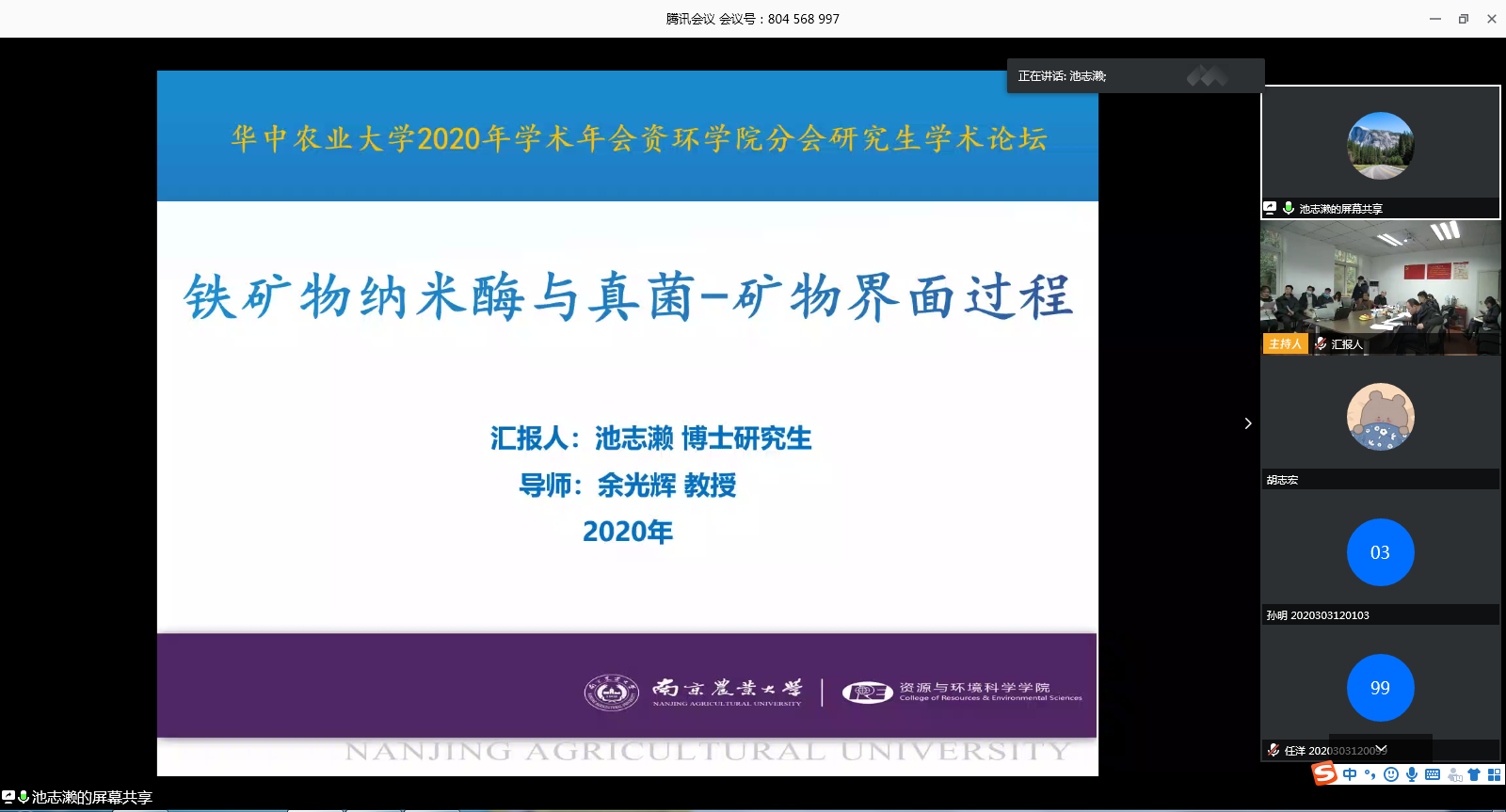12月18日,学院和国家环境保护土壤健康诊断与绿色修复重点实验室共同主办的2020年资源环境全国优秀博士生论坛通过线上线下相结合的方式成功举办,来自浙江大学、中国科学院大学、南京农业大学、中国科学院等全国11个单位的21名博士生参加论坛。