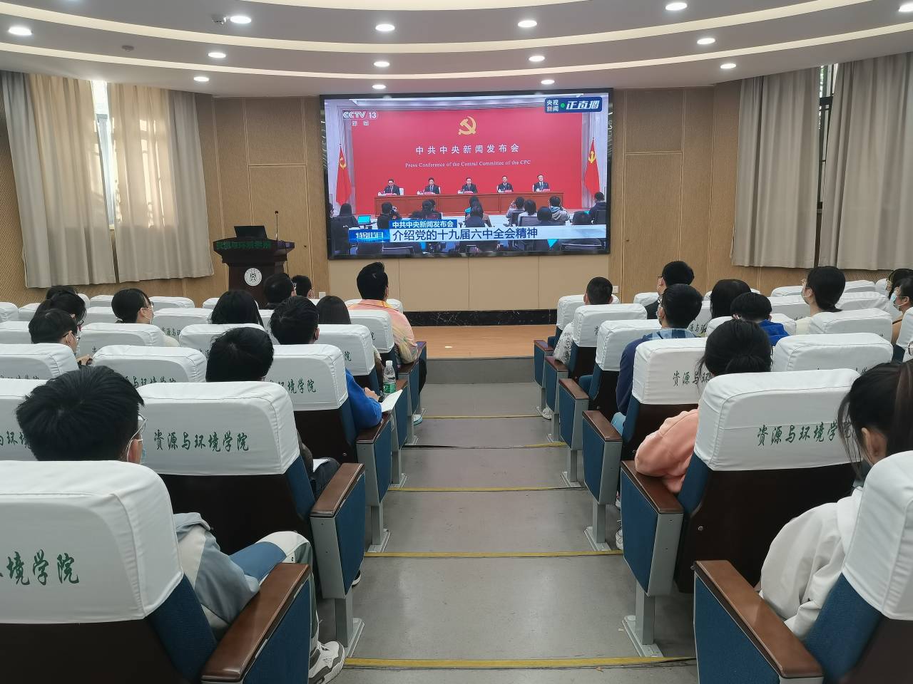 11月12日上午,中共中央举行新闻发布会介绍党的十九届六中全会精神,解读《决议》内容,并回答媒体关心的问题。资环学院组织师生代表分别在主楼315会议室和西附楼报告厅进行集中收看,观看结束后,师生纷纷讲认识、谈体会。