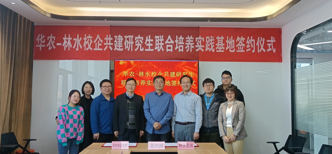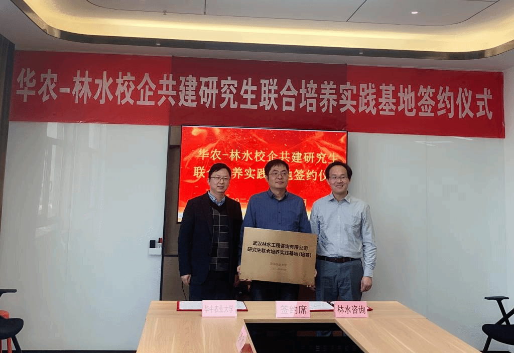 11月13日下午,“华中农业大学-武汉林水工程咨询有限公司研究生联合培养基地”签约暨揭牌仪式在林水工程咨询有限公司举行。nba88看球 党委副书记熊海林、副院长蔡鹏、生态系张晓明副教授、林水工程咨询有限公司董事长兼总经理郭晓亮、行政人事部总监孙慧玉等出席了此次授牌仪式。
