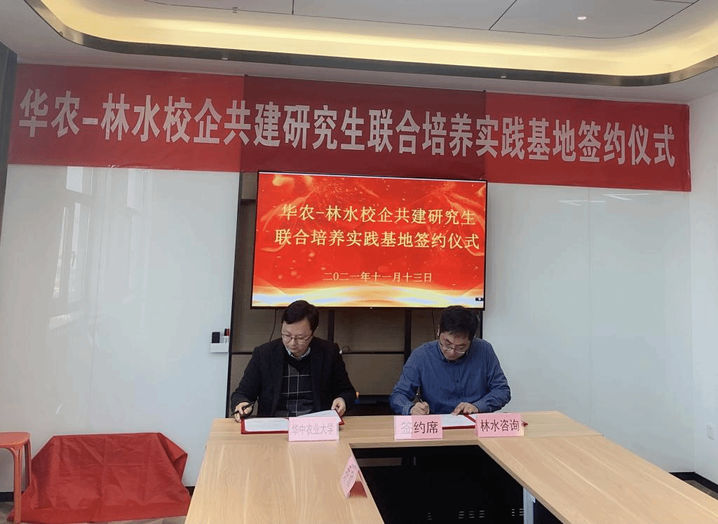 最后,蔡鹏和郭晓亮分别代表华中农业大学和武汉林水工程咨询有限公司签订了研究生联合培养实践基地(培育)合作协议,并为实践基地进行授牌。