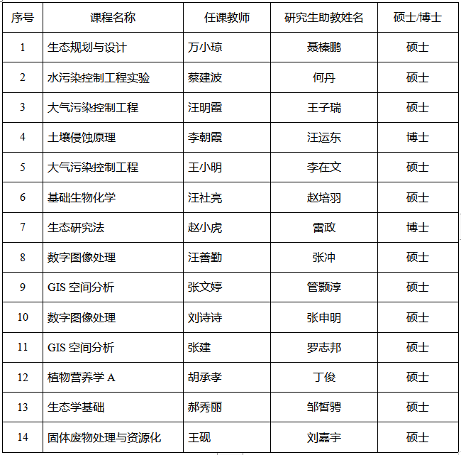 根据《华中农业大学研究生“三助一辅”实施办法》(校发[2023]157号)文件精神,经个人申请、导师和任课教师推荐、学院审核,拟聘用以下14名研究生担任2023-2024-2学期《生态规划与设计》等本科生课程助教,现予以公示。