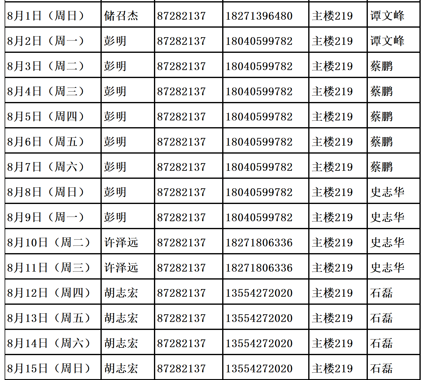 1.值班时间为上午8:30-11:30,下午3:00-5:30。 2.带班领导值班应当在武汉市,值班人员需在主楼219办公室值班值守,主楼219的钥匙在126房间领取,用完后归还。 3.值班人员要严格落实值班工作岗位责任制,加强安全巡察和隐患排查。如遇紧急情况和突发事件,要立即反应、及时报告、迅速调度、及时反馈。
