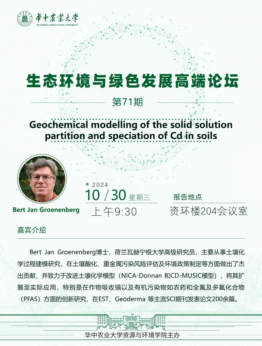 【高端论坛】第71期:Geochemical modelling of the solid solution partition and speciation of Cd in soils