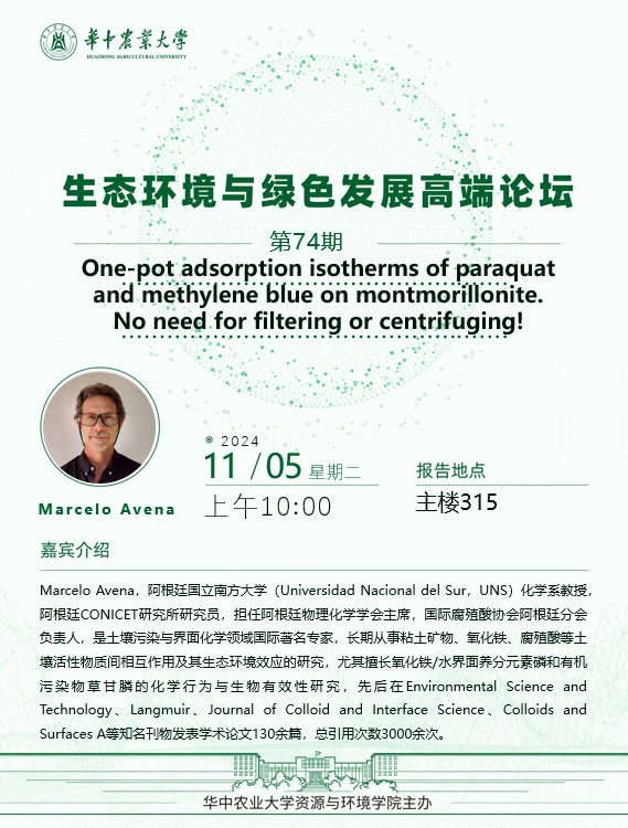 【高端论坛】第74期:One-pot adsorption isotherms of paraquat and methylene blue on montmorillonite. No need for filtering or centrifuging!